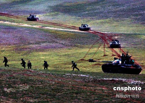 9月25日上午,中國人民解放軍“礪兵--2008”演習在塞北大漠展開。這場演習是一場在復雜地形、復雜電磁環(huán)境、作戰(zhàn)信息“背靠背”情況下,跨軍區(qū)聯合、多兵種協同、陸航空一體、實兵檢驗性戰(zhàn)術集團立體機動攻防戰(zhàn)斗演習。中新社發(fā) 宋吉河 攝