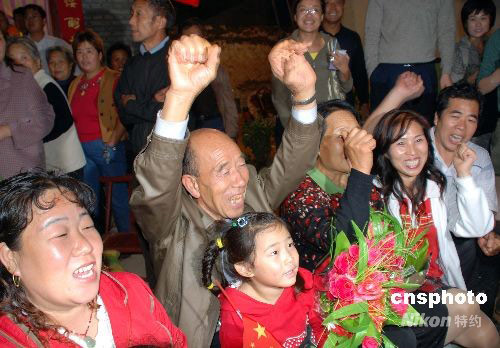 看到發(fā)射成功時(shí),景海鵬的父親舉起雙手,母親也豎起了大拇指。中新社發(fā) 張雷杰 攝