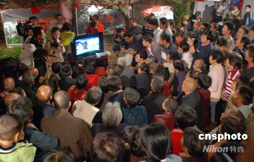 圖:鄉(xiāng)村父老觀齊聚景海鵬家關(guān)注“神七”