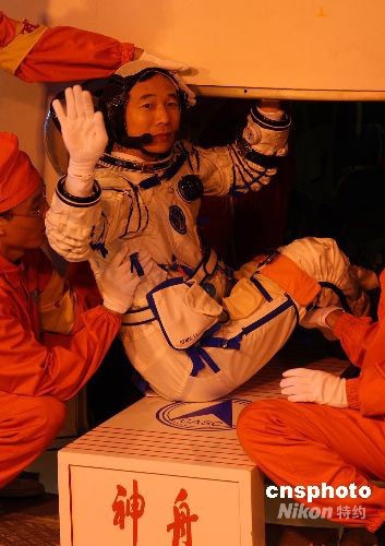 景海鵬進入神舟七號飛船返回艙。中新社發(fā) 秦憲安 攝