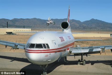 特技人道格駕駛一輛摩托車(chē)以時(shí)速每小時(shí)73英里的速度,精確地從一架翼展達(dá)48.8米的飛機(jī)上飛過(guò),并成功地降落在一個(gè)長(zhǎng)36.6米的斜坡上。
