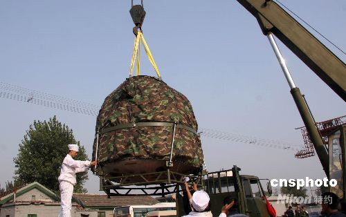 9月30日下午,神舟七號載人飛船返回艙乘專列由內(nèi)蒙古運抵北京昌平火車站,“神七”主著陸場正式將返回艙移交給飛船研制單位——中國空間技術(shù)研究院。圖為工作人員將返回艙從火車吊裝到專用汽車上,中國空間技術(shù)研究院在車前懸掛上迎接返回艙回家的標(biāo)語。