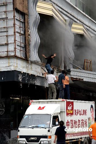 10月5日下午,廣西玉林市瑪田俱樂(lè)部在裝修過(guò)程中不慎起火,致使正在施工的21名工作人員被困火場(chǎng),經(jīng)玉州消防大隊(duì)官兵20多分鐘奮力撲救,大火被撲滅,受困人員得以安全疏散。圖為一被困女子跳下路邊貨車逃生。中新社發(fā) 黃詩(shī)斌 攝