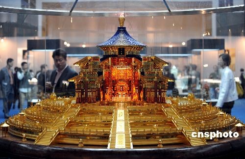 十月十四日,鑲有約20萬粒寶石的“天壇祈年殿”工藝品引人注目。這件作品高1.38米,重2.5噸,以金銀、寶石等材料制成。當(dāng)日,中國傳統(tǒng)工藝美術(shù)精品大展在北京民族文化宮舉行,該展集中展現(xiàn)了改革開放以來中國工藝美術(shù)三十年發(fā)展成就。中新社發(fā) 廖攀 攝
