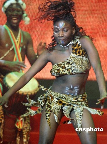 10月16日晚,2008北京大紅門國際服裝節(jié)開幕晚會(huì)在北京舉行,晚會(huì)匯聚中外模特,展示歐、美、亞時(shí)裝新款作品,來自加拿大THE KILL KENNYS樂隊(duì)、非洲AFRIACANRYTHM樂團(tuán)以及中國內(nèi)地歌手等參加演出。圖為非洲歌舞助興北京大紅門國際服裝節(jié)。中新社發(fā) 錢興強(qiáng) 攝