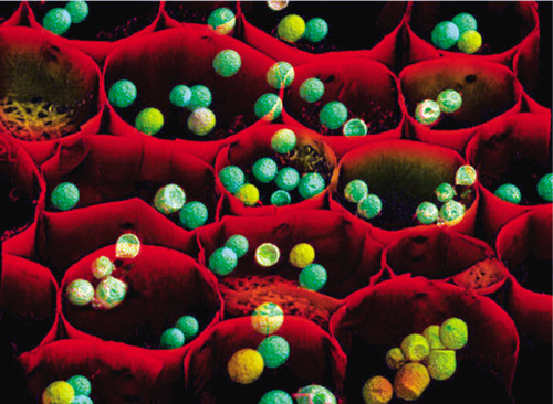 鈴蘭,阿爾伯特·圖森攝,放大1300倍。拍攝地點:美國阿拉巴馬州伯明翰。細(xì)胞學(xué)家圖森已從事顯微攝影25年。圖中,紅色的是細(xì)胞壁,綠色和黃色的是淀粉顆粒。所用技術(shù):共焦。