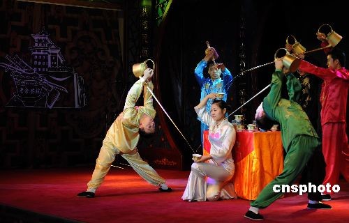 10月20日,北京老舍茶館內(nèi)長嘴壺沏茶表演精彩絕倫。當日,文化部授予老舍茶館“國家文化產(chǎn)業(yè)示范基地”在店內(nèi)揭牌。老舍茶館目前已接待幾十位國外元首政要,成為北京重要的文化產(chǎn)業(yè)基地。 中新社發(fā) 廖攀 攝