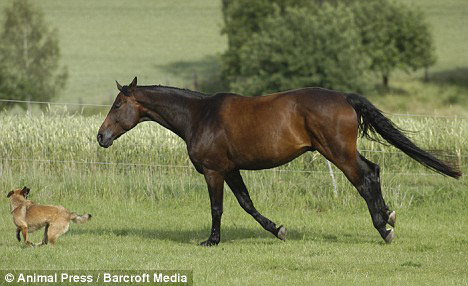 當(dāng)時(shí),一條比利時(shí)牧羊犬正在追逐一匹混血馬,不料這匹任性的馬卻不聽(tīng)牧羊犬的“指揮”,當(dāng)即脾氣大發(fā),掉頭對(duì)牧羊犬反擊,試圖用嘴咬牧羊犬的尾巴。受到驚嚇的牧羊犬壓著尾巴灰溜溜地逃跑。