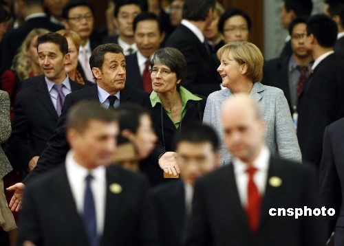 法國總統(tǒng)薩科奇與德國總理默克爾出席會(huì)議。中新社發(fā) 盛佳鵬 攝
