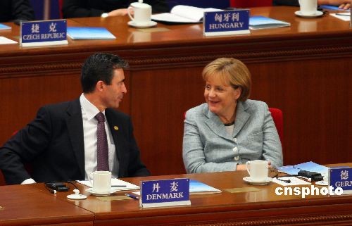 德國總理默克爾與丹麥?zhǔn)紫嗬鼓律陂_幕式上相談甚歡。中新社發(fā) 廖文靜 攝