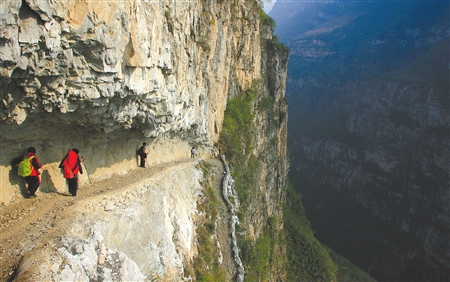 10月14日上午10時,湖北志愿者隊伍來到古路村山腳。如果不是偶爾發(fā)現(xiàn)裝載行李的騾馬在絕壁間行走,無法想象幾近90度的陡壁上竟有一條千回百轉(zhuǎn)的“Z”字形“騾馬道”。這條山道沿途七拐八彎,最窄的地方只有40厘米寬。行走在這樣的高空回廊上,讓人頭昏目眩。