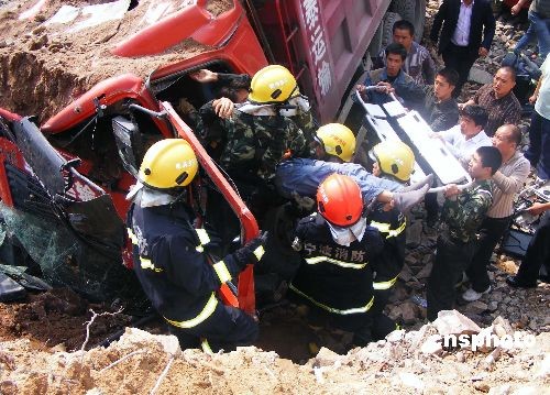 圖:大卡車制動(dòng)失靈撞向山石 司機(jī)被埋(2)