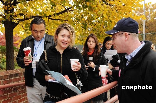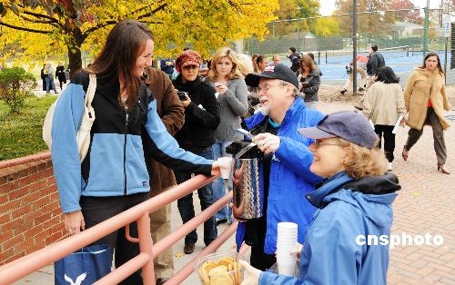 在臨近華盛頓的弗吉尼亞阿靈頓郡中心圖書館投票站,很多選民因為起得早,沒有吃早飯,此時來了兩位送餅干和熱咖啡的?墒,這兩位開口就問:你是奧巴馬的投票者么?一位女士說“Yes!”,于是馬上咖啡餅干免費奉上。中新社發(fā) 邱江波 攝