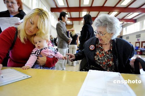 當(dāng)?shù)貢r間十一月四日,美國總統(tǒng)選舉投票日,民眾參與熱情高,一百零一歲的高壽老嫗瑪?shù)吕蚰取ぢ鹇逶谕镀焙,和鄰座半歲的幼童溫特嬉戲。中新社發(fā) 陳鋼 攝