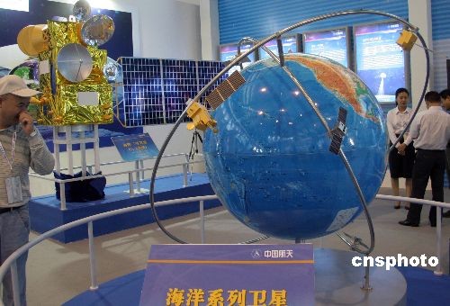 圖為中國航天科技集團公司研制的海洋系列衛(wèi)星在珠海航展展出,左上為海洋二號衛(wèi)星模型。中新社發(fā) 孫自法 攝