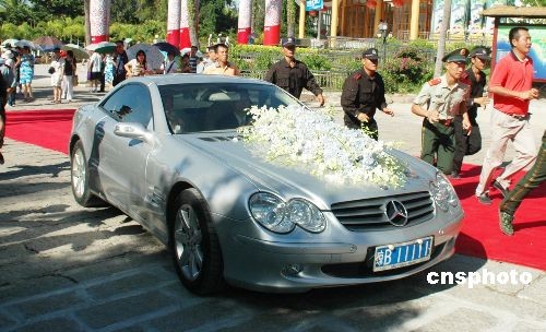 11月6日,2008北京奧運(yùn)會(huì)體操“全能王”在海南三亞著名的天涯海角景區(qū)的沙灘上舉行盛大浪漫的婚禮,與新娘楊云經(jīng)過(guò)8年的愛情長(zhǎng)跑,終于走進(jìn)婚姻的殿堂。圖為楊威迎娶楊云的豪華婚車。中新社發(fā) 尹海明 攝