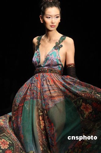 11月9日晚,在北京舉行的中國國際時裝周2009春夏系列發(fā)布上,模特展示鄧皓“似水女人”時裝作品。中新社發(fā) 錢興強(qiáng) 攝