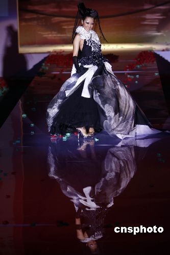 11月11日,一場設(shè)計(jì)主題是“天色”的高級(jí)時(shí)裝發(fā)布會(huì)于2008中國國際時(shí)裝周(2009春夏系列發(fā)布)期間在北京飯店舉行,強(qiáng)烈的視覺沖擊和舞臺(tái)效果為觀眾帶來一場視覺盛宴。中新社發(fā) 盛佳鵬 攝