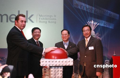 當?shù)貢r間11月19日晚,香港特區(qū)行政長官曾蔭權(quán)在英國倫敦郡禮堂,向英國業(yè)界介紹新成立的香港會議及展覽拓展部(MEHK),以推廣香港的會展及旅游業(yè)。圖為曾蔭權(quán)和香港旅游發(fā)展局總干事劉鎮(zhèn)漢等在倫敦啟動MEHK。中新社發(fā) 李鵬 攝