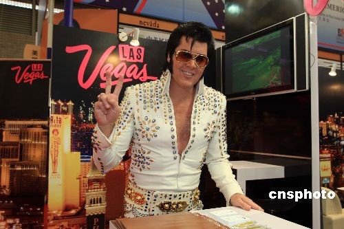 11月20日,美國(guó)拉斯維加斯“貓王”親臨上!岸00八中國(guó)國(guó)際旅游交易會(huì)”,并站臺(tái)推介美國(guó)旅游。中新社發(fā) 潘索菲 攝