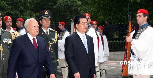 希臘總統(tǒng)帕普利亞斯二十四日下午在總統(tǒng)府舉行儀式,歡迎中國國家主席胡錦濤訪問希臘。圖為胡錦濤在帕普利亞斯陪同下檢閱希臘國家儀仗隊。中新社發(fā) 吳衛(wèi)中 攝