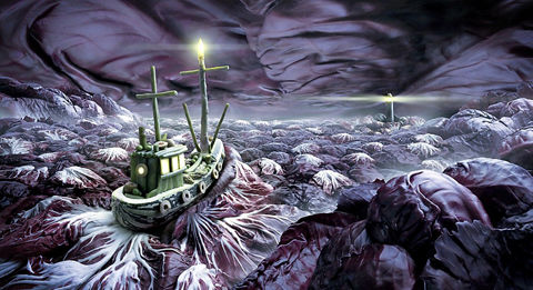 狂怒的大海和暴風(fēng)雨天空由紅色卷心菜制成,而船體是一個小胡瓜,舵手室是嫩豌豆形成的,而桅桿是直立的蘆筍。