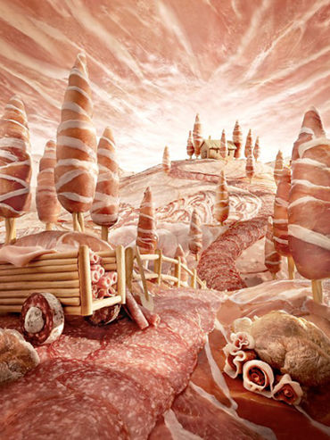托斯卡納風(fēng)景是由面包棒打造的小屋、手推車和巖石,意大利冷肉用于裝扮天空、樹木和山丘。