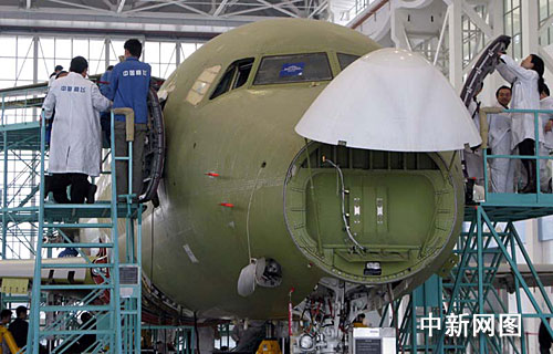 中國商飛上海飛機(jī)制造廠ARJ21總裝生產(chǎn)線,科研人員正在總裝ARJ21-700新支線飛機(jī)。