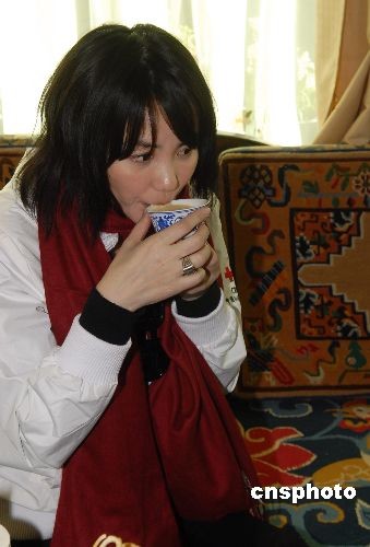 王菲在藏家做客學(xué)喝酥油茶。