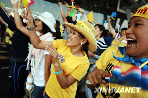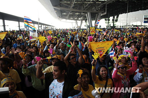 12月3日,泰國反政府的人民民主聯(lián)盟(民盟)支持者在曼谷素萬那普國際機(jī)場載歌載舞。 當(dāng)天,民盟結(jié)束對總理府和曼谷兩座機(jī)場的占領(lǐng),宣稱推翻頌猜政府的目的已經(jīng)達(dá)到,所有反政府集會全部停止。