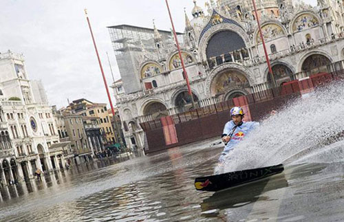專業(yè)水上滑板高手鄧肯·祖爾在洪水中穿行在威尼斯的圣·馬可廣場(chǎng)。