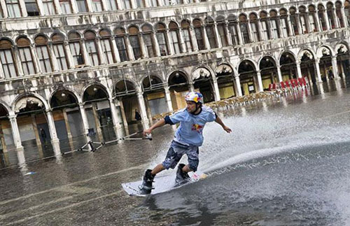 近日,意大利“水城”威尼斯遭20年不遇的洪水襲擊,洪水淹沒(méi)了街道,全城交通幾乎陷入癱瘓?墒,在洪水的侵襲一下,一幫年輕人卻“苦中作樂(lè)”,在洪水中大玩水上滑板,成為威尼斯一道另類的風(fēng)景。