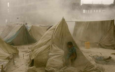 2008年10月7日,一名阿富汗難民兒童在沙塵暴中躲在一個(gè)難民營地的帳篷后面。