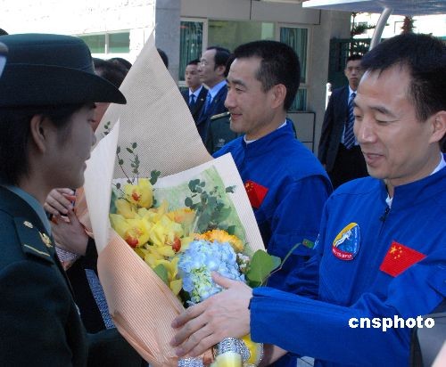 圖為代表團(tuán)團(tuán)長張建啟向駐澳門部隊司令員王玉仁贈送神舟七號飛船模型。中新社發(fā) 畢永光 攝