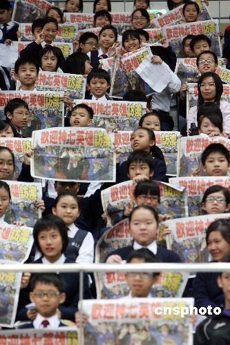 圖為澳門(mén)學(xué)子熱切等待航天勇士的到來(lái)。