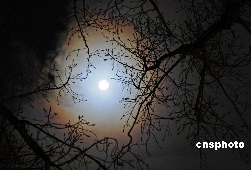 十二月十二日二十二時(shí),北京夜空中的明月出現(xiàn)一圈橙色月暈,該現(xiàn)象在云層映襯在月亮周圍時(shí)出現(xiàn)。據(jù)悉,十三日零時(shí)三十七分,月球、地球和太陽(yáng)排列成一條直線,此時(shí)月亮最圓,而在六時(shí),月球距離地球全年最近,月亮的視直徑最大。中新社發(fā) 廖攀 攝