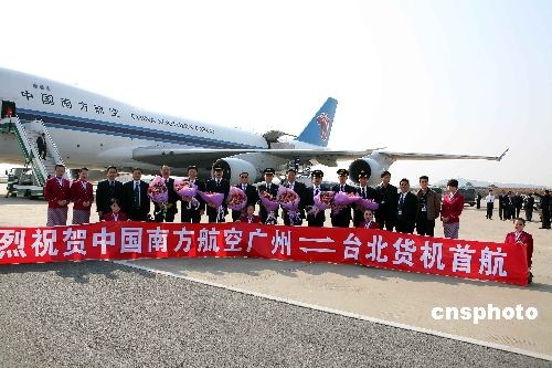 由中國南方航空股份有限公司執(zhí)飛的兩岸首架直航貨運(yùn)包機(jī),于十二月十五日下午十五時(shí)從廣州白云國際機(jī)場起飛,預(yù)計(jì)飛行一小時(shí)四十五分鐘后降落臺(tái)北桃園機(jī)場。 該架貨機(jī)型為目前世界上最先進(jìn)、最大型的波音七四七-四零零F全貨機(jī)。中新社發(fā) 羅廣泰 攝