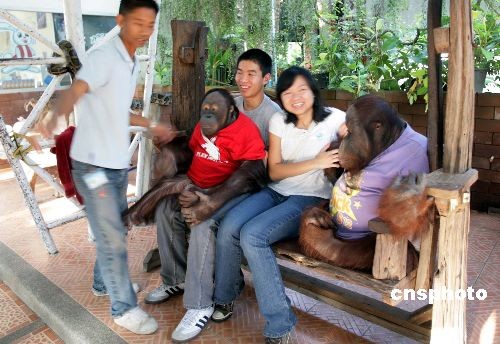 圖:中國(guó)游客在泰國(guó)與大猩猩快樂合影