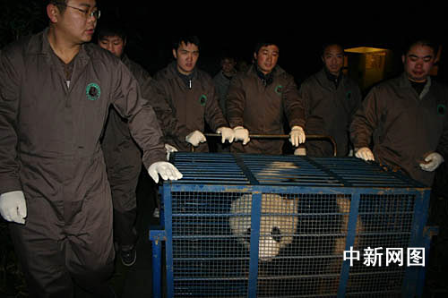 12月23日7時(shí)20分,工作人員正在將贈(zèng)臺(tái)大熊貓“團(tuán)團(tuán)”從熊貓別墅推至運(yùn)輸籠,準(zhǔn)備裝籠。