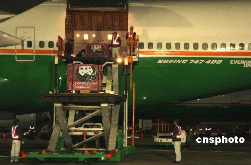 抵達(dá)臺(tái)北桃園機(jī)場(chǎng)的大陸贈(zèng)臺(tái)大熊貓“團(tuán)團(tuán)”、“圓圓”經(jīng)過(guò)檢疫程序后,它們的箱籠從長(zhǎng)榮航空專機(jī)出艙。中新社發(fā) 陳立宇 攝