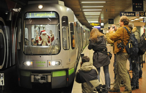 在德國漢諾威的一個(gè)地鐵站,裝扮成圣誕老人模樣的列車司機(jī)向站臺(tái)上的人們招手。