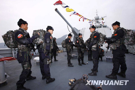 12月25日,海軍特戰(zhàn)隊(duì)員在軍艦甲板上整理裝具。