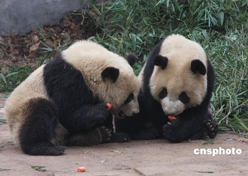 兩只幼熊貓?jiān)谘虐脖谭鍗{熊貓基地熊貓幼兒園吃食物。 中新社發(fā) 郭國(guó)權(quán) 攝