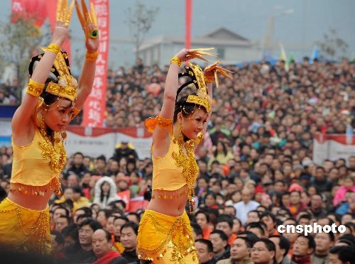 12月31日,表演“千手觀音”的業(yè)余演員,在四川大地震極重災區(qū)的擂鼓鎮(zhèn)慰問災民。北川縣受災的上萬民眾干部在此團聚,以迎元旦文藝表演告別難忘的2008年。中新社發(fā) 賈國榮 攝