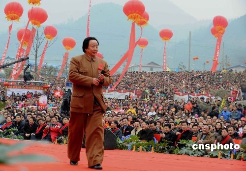 12月31日,扮演“毛主席”的川劇著名演員登臺(tái)看望四川地震極重災(zāi)區(qū)的北川縣擂鼓鎮(zhèn)災(zāi)區(qū)民眾。北川受災(zāi)的上萬(wàn)民眾在此團(tuán)聚,以迎元旦文藝表演告別難忘的2008年。中新社發(fā) 賈國(guó)榮 攝