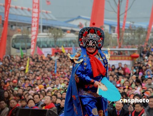 12月31日,川劇著名變臉演員在四川地震極重災(zāi)區(qū)的擂鼓鎮(zhèn)板房區(qū)前,展示噴火技藝慰問(wèn)北川縣上萬(wàn)民眾干部,以迎元旦文藝表演告別難忘的2008年。中新社發(fā) 賈國(guó)榮 攝