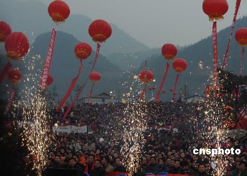 12月31日,四川大地震極重災(zāi)區(qū)的北川縣上萬(wàn)民眾干部團(tuán)聚擂鼓鎮(zhèn),燃放簡(jiǎn)單的焰火迎元旦,告別難忘的2008年。中新社發(fā) 賈國(guó)榮 攝