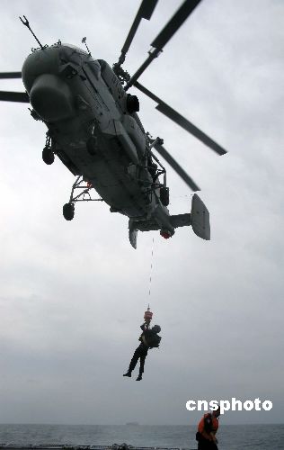 2009年元旦,中國海軍護航艦艇編隊正在印度洋航行,圖為“?凇迸灪叫型局虚_展艦機與隨艦特戰(zhàn)隊員的協(xié)同訓練。中新社發(fā) 孫自法 攝
