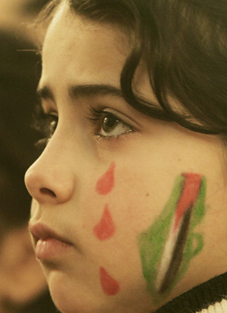 12月31日,一個臉上畫著國旗的巴勒斯坦小女孩在西岸城市拉馬拉為和平祈禱。面對國際社會巨大壓力,以色列仍然拒絕停止對加沙地帶的大規(guī)?找u,最新統(tǒng)計數(shù)字顯示,空襲已造成至少400人死亡,近2000人受傷。