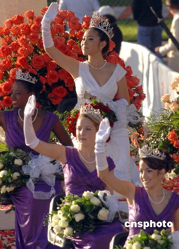 第120屆美國(guó)玫瑰花車大游行在美國(guó)加州帕薩迪納市正式舉行。新晉美國(guó)“玫瑰皇后”、華裔學(xué)生李君慧(上)與6名“玫瑰公主”一起乘坐玫瑰皇家花車引領(lǐng)大游行。